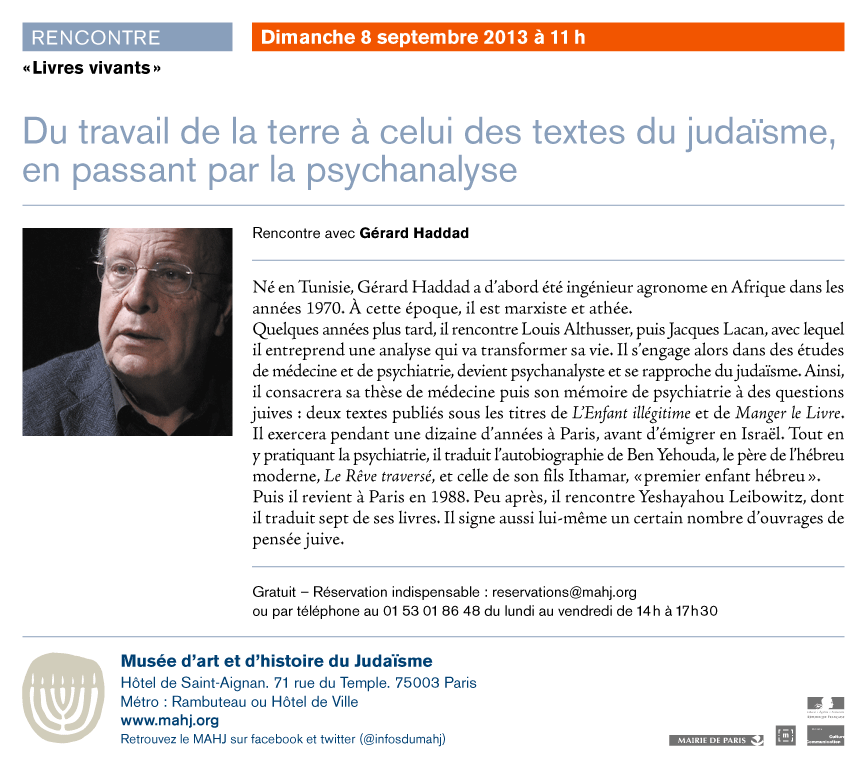 Gérard Haddad au Musée d’art et d’Histoire du judaïsme, dimanche 8 sept.